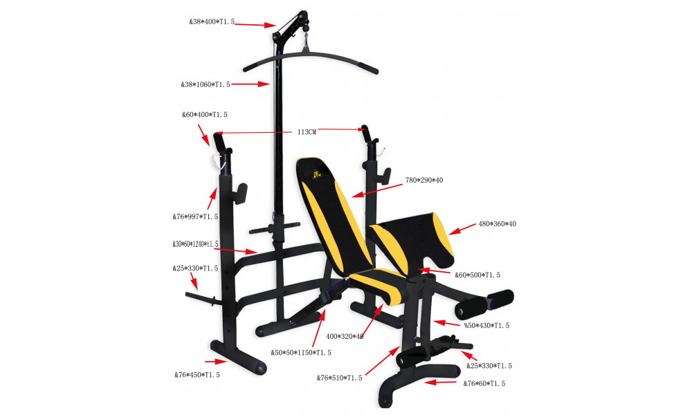 Прочная устойчивая конструкция с ударопрочным эмалевым покрытием. Стойки под штангу с замками безопасности. Рычаги блока для ног снабжены мягкими валиками. На стойках есть держатели для хранения дисков. Позволяет выполнять упражнения: жим лежа, сгибание и разгибание ног в коленном суставе, парта для бицепсов, тяга сверху.